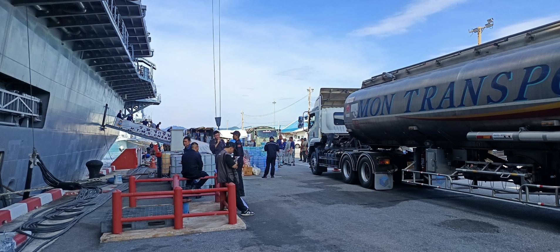 On 25 November 2025, MON Transport Co., Ltd. proudly supported the Royal Thai Navy in its critical humanitarian mission. The HTMS Chakri Naruebet prepared to set sail to the southern region to assist communities severely affected by widespread flooding. As part of this effort, the company provided high-quality fuel transportation services to deliver fuel supplies directly to the vessel, ensuring full readiness prior to its departure for Hat Yai District and nearby affected areas.